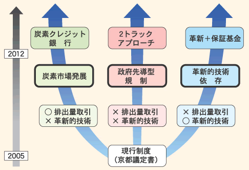Q: その研究が「気候レジームの評価」という定性的評価研究なのですね。亀山: この研究では今後10年間に世界が進展していく方向性を“シナリオ・プランニング・アプローチ”という手法(10ページSummaryを参照)を使って、今後、・国際排出量取引制度がさらに活性化する「炭素市場発展シナリオ」、・国際排出量取引が低迷し、省エネ基準の国際スタンダード化等の政策協調が求められる「政府先導型規制シナリオ」、そして、・炭素隔離・貯留や水素エネルギー等現在「革新的技術」と呼ばれている技術の実用化が急速に進展する「革新的技術依存シナリオ」という3つの異なる世界像=シナリオとして設定しました(図1)。今後、世界がこれら3つのシナリオに入って行ったときのシナリオ評価指標を明らかにして、シナリオが示す国際枠組みの検証を可能にした研究です。シナリオを評価する指標としては「環境改善効果」「費用対効果」など4つを規定しています。