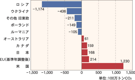 ロシア:2002年温室効果ガス排出量—1990年比−38.5%、議定書目標比−38.5%ロシアは議定書の第1約束期間について排出枠の余剰が確定的と見られています。京都議定書の批准によってロシアは、排出枠の余剰分を売れる立場です。