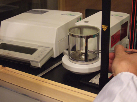 捕集した粉じん濃度を求めるためには、あらかじめ温度と湿度を一定に保った天秤室でフィルター重量を測っておき、捕集後にも全く同じ条件に1日以上置いてから計量してその差を出して計算します。1枚のフィルターで捕集される粉塵は、少ないもので10μg程度と非常に微量なため、μg単位で正確に計量する必要があります。安定した計量値が得られるまでくりかえし測定し、平均値で捕集量を求めます。