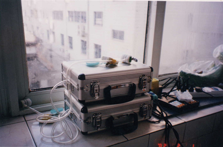 Q: 捕集器はどのような機器なのですか。田村: 小さな吸引ポンプの先に捕集ろ紙を入れたホルダーを付けたものですが、ポンプの音を小さくするために工具箱のようなケースに入れて使いました。重量は全部あわせて1.5kgぐらいでしょうか。室内と屋外の機器は家庭用電源で稼働させて、個人曝露用は家の中でもしょっちゅう移動させますので電池で稼働させます。個人で携帯する場合はケースごとでは重くなるので、捕集器だけ携帯ということを考えましたが、初回の瀋陽において騒音が原因で個人曝露調査を拒否されてしまったため、ウエストポーチのなかにウレタンフォームを詰めてポンプの音を小さくするようにしました。