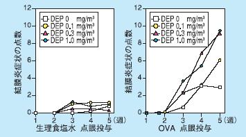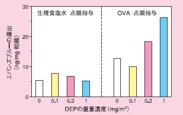 アレルギー性結膜炎に及ぼすディーゼル排気曝露の影響を、血漿の漏出を指標として検討しました。雄のモルモットを用い、清浄空気またはディーゼル排気に5週間曝露し、その間1週間おきに計6回抗原である卵白アルブミン(OVA)を点眼投与しました。 その結果、ディーゼル排気曝露下において繰り返し点眼投与によるアレルギー性結膜炎の症状を数値化した累積値は(濃度0.1〜1.0mg/m3)、清浄空気曝露曝露群に比べ症状の値が増加しました(図4)。一方、血漿漏出の測定は6回目の抗原投与後に行いました。0.3および1.0mg/m3の微粒子を含むディーゼル排気曝露下では、ディーゼル排気の濃度に依存して血漿の漏出の増加が明らかとなりました(図5)。これらから、ディーゼル排気曝露はアレルギー性結膜炎を悪化する作用があることが示唆されました。