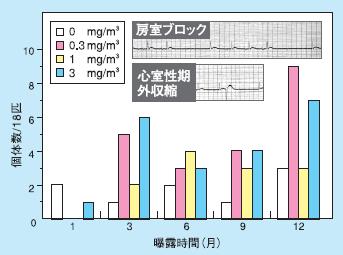肺に炎症を起こし呼吸機能が低下することから生じる血中酸素濃度の低下は、心機能に重大な影響を及ぼす可能性が考えられるため、換気機能検査やガス交換機能の変化を測定したところ、ディーゼル排気曝露によりいずれも低下することが確認されました。これは、異常心電図の発現に関係する所見と考えられました。