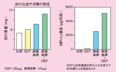気管支ぜん息、肺炎、気管支炎の既往者や、高齢者、免疫不全者等、PM2.5に高感受性群の人びとは感染症にかかりやすいという特徴を持ち、感染を契機に重症化することがしばしば経験されますが、その病態悪化のメカニズムは明らかにされていません。感受性の高い感染者の急性悪化には、グラム陰性桿菌(たとえば肺炎菌など)がしばしば関与します。そこで、グラム陰性桿菌由来の細菌毒素による炎症性肺障害に、DEPが及ぼす影響を検討しました。その結果、細菌毒素による肺障害はDEPにより顕著に増悪することがわかりました(図8)。