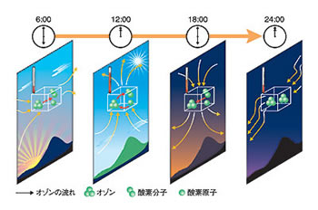 | 朝 : | オゾンの光解離によりオゾンが減少 |