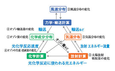 化学気候モデルでは、ある時刻における風速分布や気温分布、化学成分分布を用いて、力学・輸送計算、放射計算、化学計算を行い、次の時刻での各量の分布を計算します。こうした計算を繰り返すことによって各量の時間変化を求めることができます。このような計算手順により、(1)オゾン量の変化→(2)太陽放射吸収量の変化→(3)気温分布および風速分布の変化→(4)オゾンの輸送量、生成・消滅量の変化→(1)オゾン量のさらなる変化、というような、オゾンに関するフィードバック過程(作用のループ)を、モデル計算の時間進行に合わせて適切に再現することが可能になります。