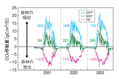 図1は2001~2003年のCO2フラックス(樹木など植物の光合成によるCO2吸収量(GPP)と植物や土壌微生物の呼吸によるCO2放出量(RE))を示しています。雨により渦相関法が使えない場合もあります。その時は補完式を用いて温度や日射量から森林の正味のCO2吸収量(NEP)を推定しています。結果は、すべての数値が夏に大きく冬に小さいという季節変化の傾向をはっきり示しています。太陽の光の強さの影響が大きいGPPは初夏にピークとなり、一方、温度の影響が大きいREは盛夏がピークとなります。両者の差であるNEPは、初夏にピークを迎えます。しかしこれらの値は年々変化します。