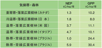 なお、図では表していませんが、吸収したCO2を炭素に換算して1年間の合計を計算すると、光合成によるCO2吸収量は16.3~16.4tC/ha/年、正味のCO2固定量は1.6~2.5tC/ha/年となりました。計算結果に幅があるのは、呼吸によるCO2放出量の計算(光合成の起きない夜間のCO2放出量を元に呼吸を温度の式として表し、これを用いて昼間の呼吸量を推定します。)や正味のCO2固定量の推定部分における不確実性を考慮に入れているからです。得られた1年間の値は、北米の温帯の落葉広葉樹林での観測例と同程度でした(表1)。