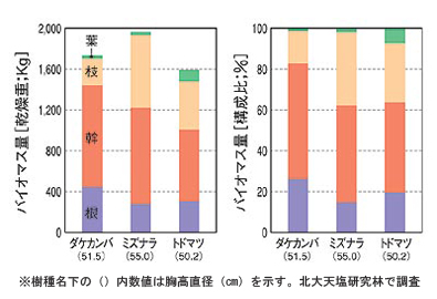 また、材として経済価値の高い幹が樹木全体としてみると約1/2に過ぎないことが分かりました。