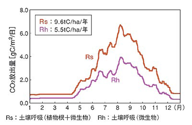Q:細かい配慮が必要ですね。藤沼: このようにして調べた結果、土壌からのCO2の放出量は炭素換算で9.6tC/ha/年と推定できました。具体的な推移は図2のようになります。土壌呼吸(速度)は、夏季に多く、冬季には極めて少ない値を示しています。地温との相関も高く、温度の上昇とともに高くなっています。ただ、土壌水分との相関は見られませんでした。北米などの先行研究では、土壌呼吸は水分の制限の影響を受けることが多いのですが、東アジアの温帯では降水量が多いため、水分の制限が影響しにくいことが、この違いを生み出していると予想されました。