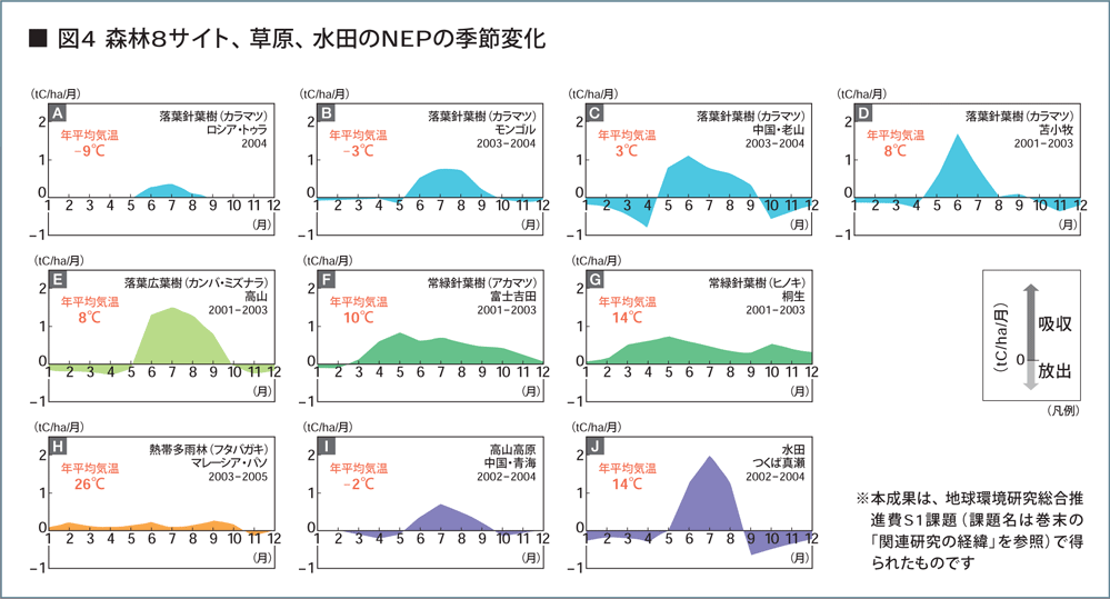 アジア観測サイトのデータを収集して年間、月別に炭素換算で生態系純生産量(NEP)の季節変化を表しました。NEPは植生の違い、気温と降水量の季節変化の差異を反映してサイトごとに特色あるパターンとなっています(図4)。