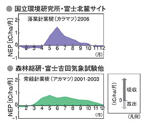 富士北麓サイトのカラマツ林近隣のアカマツ林では、森林総研がCO2フラックスの観測を行っています。この2つのサイトの結果を比較することにより、同じ気候条件のもとで、異なるタイプの森林でのCO2フラックスの環境因子の変動に対する応答特性の違いを評価することが可能になると考えられます(図6)。このような観測は世界的にも貴重なものであり、生態系の数値モデルの高度化に非常に重要な情報を提供できることになります。現時点では、観測データの検証が完了していないため、精細な定量的比較はまだ行われていませんが、概算値では両サイトの年間のCO2収支には大きな差がないものの、吸収・放出の季節性には著しい違いがあることが明らかとなっています。