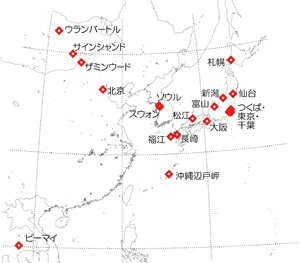 大気中のエアロゾル(浮遊微粒子)をターゲットとしたライダー観測は、国立環境研究所がまだ国立公害研究所と名乗っていた時代から行われ30年以上の歴史がありますが、アジア地域の多地点で同時に連続観測を行うようになったのは2001年の春からです。それから7年が経過し、観測地点も大幅に増えました。2008年4月現在、日本・韓国・中国・モンゴル・タイの計19カ所で国立環境研究所がシステム開発したライダーによる自動連続観測が行われています(図2)。全観測地点の観測データはインターネットを経由して国立環境研究所に届けられます。観測から1時間以内にライダーのホームページで、その基本解析画像を配信しています。