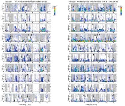 その基本解析画像のほかに、ライダーの信号を解析して上空に雲が存在するかどうかを判定し、晴天域や雲より下の高度に存在するエアロゾルの量を求めます。最後にそのエアロゾルが黄砂かそれ以外の大気汚染粒子なのかを分類し、観測地点上空のエアロゾル情報を算出しています。図3は、2007年5月の31日間について、ネットワークライダーのうち10地点分の観測結果を用い、いつ、どの高度に、どれくらい、エアロゾルが存在したかを示したものです。こうした観測とデータ処理により、各地に黄砂が飛来したタイミングやその量を特定できるようになりました。