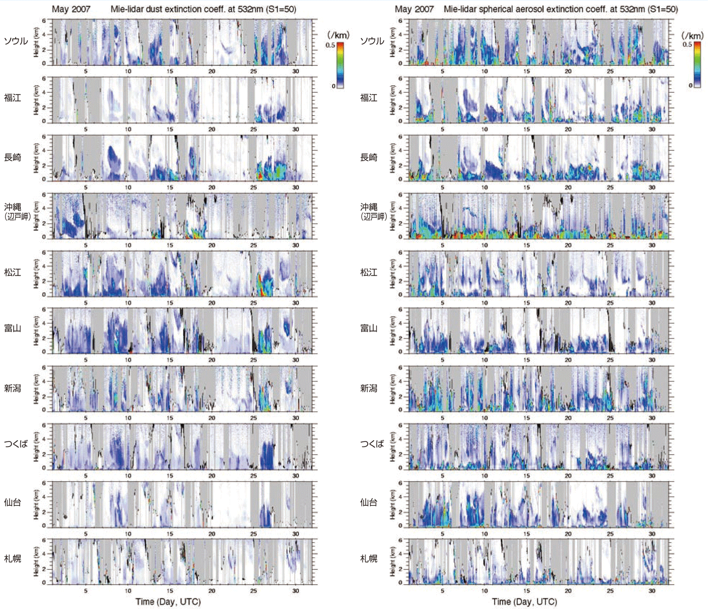 また、大気汚染起源の微粒子が黄砂よりも低い高度に定常的に存在することも読み取ることができます。これらの情報は、エアロゾルの分布やその輸送を表現する数値モデルの検証などに広く活用されています。