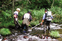 北海道での現地調査の様子。背中に背負っているのが、魚を捕獲するための電気ショッカー。