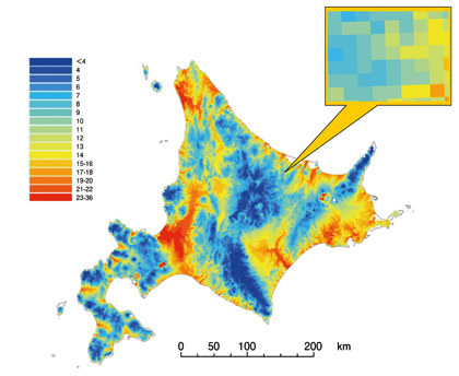 Q: 統計モデルとは一体どのようなものなのですか。福島: ある地点の魚類の種数は、その標高や気温・降水量などの気象条件、また緯度・経度、流域面積の大小、などさまざまな環境要因、さらにダムの有無という人為的要因によって決定されると考えます。数千もの魚類の種数とこれら要因のデータの組み合わせがありますので、どの要因が種数に対してプラスに働くか、マイナスに働くか、その強弱はどの程度か、ということを数式で表すことができます。それをここではモデルと呼びます。でき上がったモデルで、実際には魚類調査の行われていない地点の種数を、その場所の環境要因から推定した結果が、淡水魚類の種の多様度マップになります(図2)。