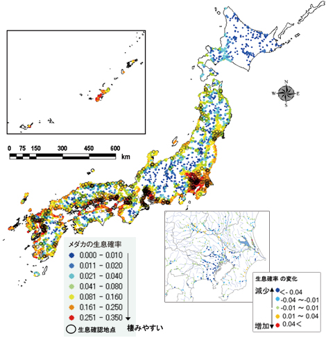 例えば絶滅危惧種の1つにメダカがいます。メダカは一般的に、本州より南の比較的標高の低い地域で、昔はごく普通に見られたといわれています。メダカの生息確率を示す2002年の予測結果では、やはり西日本の平野部を中心に高めの値となっています(図3左上)。しかし、1977年と2002年の比較では、都市近郊部を中心に生息確率が小さくなった地点が多く見られました(図3右下、関東地域の拡大図)。
