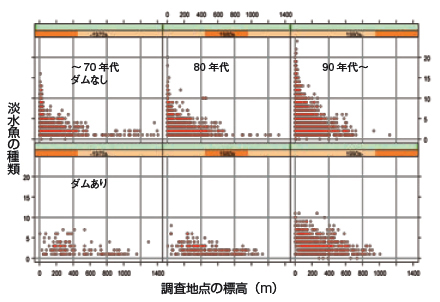 北海道で行われた過去の魚類調査(約7000件)の1件ごとについて、捕獲された魚類の種数を縦軸に、また調査地点を横軸にとって、調査の行われた時代ごとにプロットしてみました(図4)。すると、ダムで分断された調査地点の種類(下段)が、下流にダムのない地点の種数(上段)と比べ明らかに少ないことがわかります。とくに、標高の低いところで行われた魚類調査ほどダムによる種類の減少量が大きいのです。そもそも標高低いところほど多種多様な魚類が生息しますので、さらにその下流にダムが造られると種の多様性は大幅に低下します。