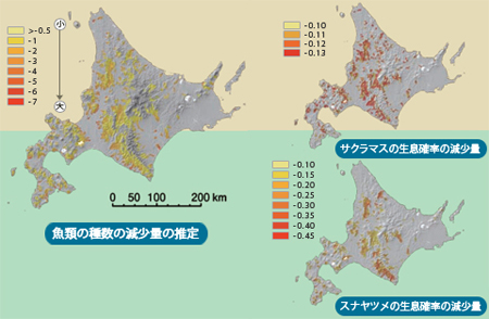 淡水魚の種の多様度マップは、2つのシナリオで描くことが可能です。1つは北海道にダムが一つもない仮想的な条件で種数を推定したマップ、もう1つは実際のダムの分布とその影響を加味して推定したマップです。この2つをGIS上で重ね合わせて両者の種数の差分を地域ごとに求めれば、それはダムによって減少したであろう淡水魚の種数の分布図となるわけです(図5)。