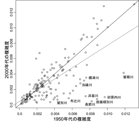 ここで明らかになったことは、道内を流れるほぼすべての河川が、部分的に直線化されていたことです。この傾向はとくに中流、下流で顕著でした。川が真っ直ぐになったことで河川地形が単調になり、地形の多様度を表すエントロピーが約73%にまで低下していました(図6)。