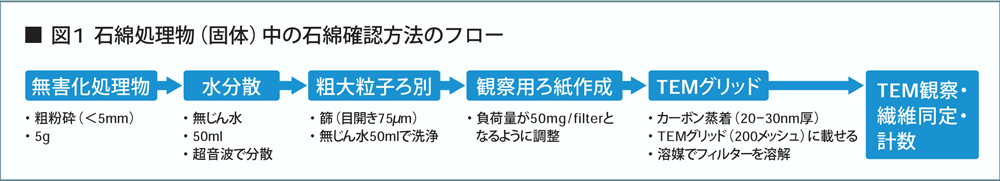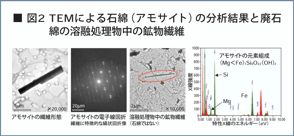 石綿含有廃棄物の無害化処理は処理物に石綿が検出されないことです。固体の石綿分析としては、位相差顕微鏡とX線回折法(XRD法)が一般的ですが、両方法では不十分です。0.4μm以下の微細繊維の観察ができないこと、石綿識別が難しいこと、0.1重量%以下の低濃度が測定できないからです。細い繊維の観察や石綿と非石綿の区別が確実な方法は透過型電子顕微鏡(TEM)分析法です。私たちが提案した処理物(固体)の石綿試験方法を図1に示します。飛散しやすい繊維を水で分散したのち、石綿を含む微粒子をろ紙に載せて電子顕微鏡試料とします。TEMの長所は、繊維一本一本について、繊維の結晶構造が電子線回折(ED)で確認ができ、化学組成が測定できる(エネルギー分散分光分析、EDSによる)ことの2点です。石綿の一種で毒性の高い角閃石系のアモサイトの顕微鏡写真、電子線回折、化学組成図の例と、熱処理物(溶融スラグ)のTEM像を図2に示します。石綿では特徴的なED像がみられます。熱処理物には鉱物繊維は観察されますが、そのED像はガラス化していることを示し、ケイ酸アルミニウムの一種であることから、石綿ではないことが確認できます。鉱物繊維は毒性が低いとされていますが、計数することを推奨しています。