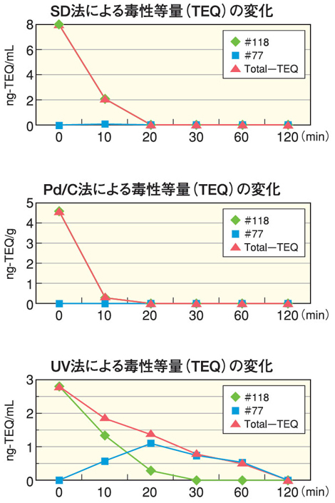 たとえば、2,3’,4,4’,5’-五塩化ビフェニル(#118)の分解経路を図4に示します。この異性体はオルト位に塩素を1つ有するモノオルソ体でダイオキシン様の毒性があります。一脱塩素化体は、SD法では塩素数の多いフェニル基のパラ位塩素が脱離した2,3’,4’,5-四塩化ビフェニル(#70)、Pd/C法では塩素数の少ないフェニル基のパラ位塩素が脱離した2,3’,4,5-四塩化ビフェニル(#67)、UV法では塩素数の多いフェニル基のオルト位塩素が脱離した3,3’,4,4’-四塩化ビフェニル(#77)が多く生成していました。いずれの方法も一塩化ビフェニルを経て最終的には塩素のないビフェニルになりました。分解に伴って変化するダイオキシン様毒性については図5に示しました。Pd/C法とSD法は2,3’,4,4’,5’-五塩化ビフェニル(#118)の分解とともに速やかにダイオキシン様毒性が減少しました。UV法では分解初期に生成するダイオキシン様の毒性を持つノンオルソ体(オルト位に塩素を持たない)である3,3’,4,4’-四塩化ビフェニル(#77)の影響により毒性の減少は遅かったのですが、反応時間の経過とともに徐々に減少し、最終的にはなくなりました。
