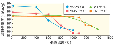 次に石綿の熱処理でどのような変化が起こるか、X線回折(鉱物組成変化)に加えて、TEMによる繊維数の変化を調べました。これは世界でも初めての結果です。4種類の石綿の1500℃までの熱処理物の繊維数濃度を図3に示します。角閃石系のトレモライトとアモサイトは1400℃でも非石綿であることが確認できません。実際の無害化処理では、十分な実証実験による確認が必要であることを示しました。