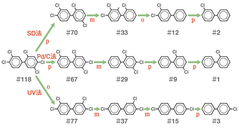 研究では、3つの分解方法、パラジウムカーボン(Pd/C)触媒を使い水素ガスによってPCBの塩素を水素に置換するPd/C触媒分解法(Pd/C法)、アルカリ性2-プロピルアルコール中で紫外線を照射して脱塩素化する光分解法(UV法)、窒素ガス中で金属ナトリウムを絶縁油に分散させたものを用いて脱塩素化する金属ナトリウム分散体法(SD法)によってPCBの分解経路を推定し、分解反応性の違いや反応速度の比較などを行いました。その結果、3つの方法では置換塩素数や塩素置換位置によって反応性が違い、分解経路が異なっていました。