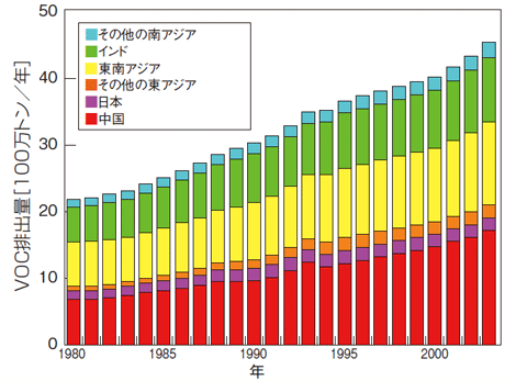 1980年から2003年までのアジア全体の経年変化をみると、NOx、VOCの排出量とも年々増加を続けています。NOxは、アジア全体では2.8倍、東アジアでは2.6倍に増加しています。なかでも中国は3.8倍、平均年率6%と非常に大きくなっています。特に2000年以降は3年間で1.3倍と過去最高となっています(図5)。このような最近の増加傾向は衛星観測データによっても検証されています。VOCは、工場・火力発電所などの燃焼施設と自動車などの輸送機関が主要な発生源で、1980年と2003年との比較では、アジア全体では2.1倍、東アジアでは2.4倍、中国では2.5倍に増えています(図6)。