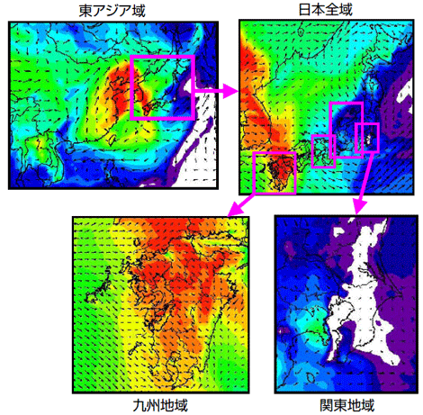 また、光化学オゾンなどの大気汚染を予測する「大気汚染予測システム」を構築し、東アジア、日本全域および関東地域における大気汚染濃度の予測結果を、ホームページから公開されています。この6月からは、環境省とも協力して、中部、関西および九州地域の大気汚染の詳細予測を試験的に開始されました。詳しくは環境GISサイトをご覧ください(図9)。