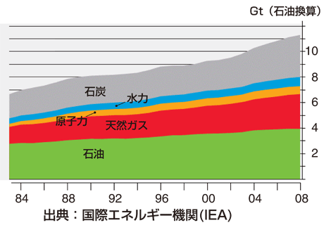 有限なエネルギー資源地球に埋蔵されているエネルギー資源にはウラン(原子力)のように46億年前の地球誕生時に宇宙塵から集まったもの、石炭・石油(化石燃料)のように数億~数千万年前の太陽エネルギーを生物活動により地球に蓄積したものがあります。これらのエネルギー資源は、再生産されない資源であり、利用すると無くなってしまいます。しかしながら、グラフに示されるように、現代社会はこれらのエネルギー資源を大量に消費しています。