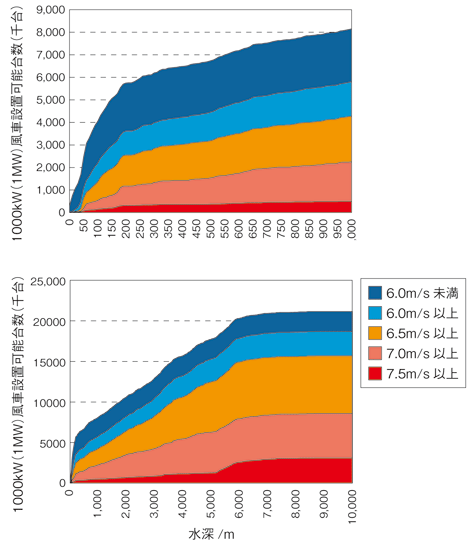 日本近海で洋上風力発電が陸上風力発電に対して優位となる風況の良い(年間平均風速の大きい)海域を探すと、係留型でも不得手とされる水深1000m以上の海域を有効に利用できるシステムが必要です。