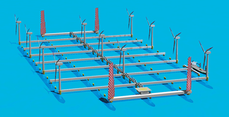 Q: この構造物を移動させる方法ですが、ヨットのような帆がついています。どうしてこのような方法になったのですか。植弘: 動き回る浮体にしようというコンセプトはあったのですが、それについては、大阪大学の高木先生に、ヨットのように揚力を使うことで移動できるかどうか検討いただきました。風車でつくったエネルギーの15%くらい使えばなんとかなりそうだというところがスタートでした。スクリューで回してもよかったのですが、東京大学の木下先生が、国立環境研究所がやるならやっぱり帆船にしよう、ということでセイリング型になりました。