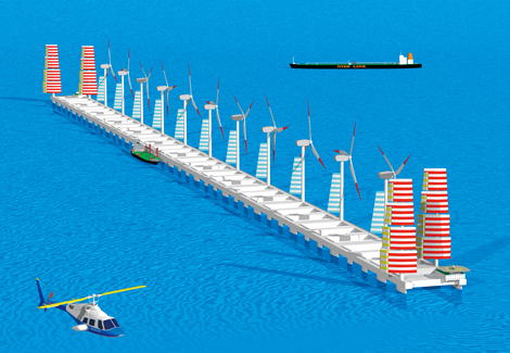 内山: 大きな研究費が獲得できるとはまったく思っていませんでした。しかし、研究を始めるとなると定量的な目標設定をしなければなりません。計量の単位としてEPRを用いることにしました。技術的には日本が開発していたメガフロート(超大型浮体式構造物)に風車を載せればそれで一件落着だろうと、安直に考えていました。私たちはコアな技術をもってないので企業、大学の協力を仰ぎました。たとえば、それまでに洋上風力発電を研究されていたJOIA(日本海洋開発産業協会)さんに行って、「今度、予算が付いてこういう研究始めたのでよろしくお願いします。ついてはこういうものの設計お願いします」とか。外に出てみたらわかったのですが、意外と国立環境研究所という看板が大きい。「国立環境研究所です」と言って企業に行くと、向こうも専門の技術者が出てきて対応してくださる。共同研究をお願いした造船や重工業の業界からすると、われわれの予算はとても小さいのですが夢の技術として面白いからと優秀な人材に参加してもらえました。 -