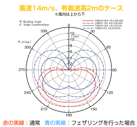 浮体の性能を評価するためのポーラー曲線今回設計した浮体は、巨大な帆船と考えることができますが、帆船としての性能を評価するのがポーラー曲線(図6)です。風は図の上から下向きに吹いているとして、帆船がどの方向にどの位のスピードで航行できるのかを表しています。左右対象なのは浮体に前後がないからです。赤の実線が風車で発電し、電動モーターは使わない時の性能で、風上への航行は無理ですが、風と垂直方向には4ノット(約2m/s)を超えるスピードで航行できます。また、緊急時に風車による発電を停止して電動モーターも活用して走ると、風上45度の方位でも9ノット(約4.6m/s)程度で航行可能です(青破線)。