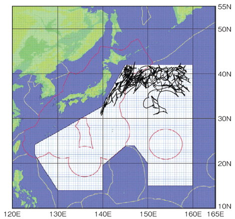 気象予報を用いて1年間の運行をシミュレーションする太平洋上で良い風を求めながら帆走した場合、どれくらいの発電量が得られるのか、1年間の気象予報を使ってシミュレーションしてみました。6日間先までの風と波の予報値を用い、浮体が壊れない波の高さとより多くの発電量が得られるように操舵するという条件で、1年間コンピュータ上で仮想的に航行させてみました。その結果、年間発電量は280GWhとなり、設備稼働率として約58%の値を得ることができました。これは、固定地点に留まっていては得られない高い値です。