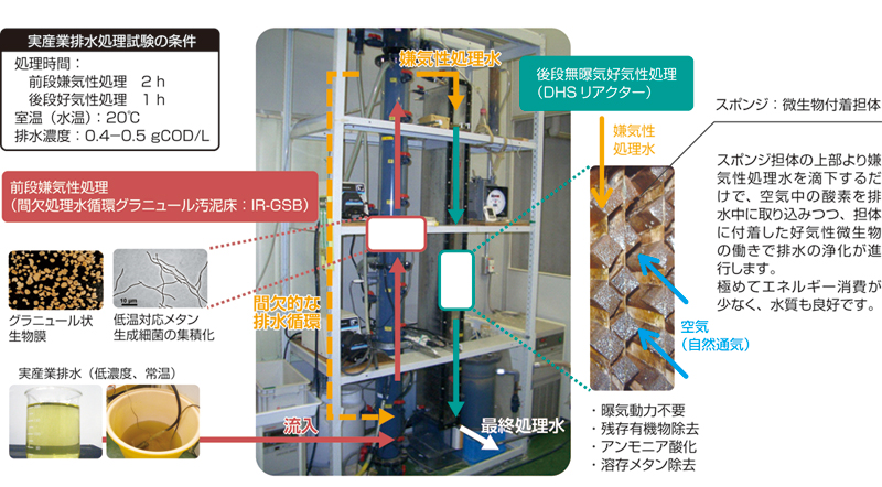 最終的な結果として、低濃度排水(0.3~1.0gCOD/L)の無加温(10~15℃)処理において、従来法の数倍の高速処理(1~4時間)を達成、世界最高レベルの処理能力を実現しています。また後段に無曝気好気処理のリアクターを設置し、十分な水質を得ることも可能となりました。現在は技術の実用化を目指し、実産業排水(製糖排水)を用いた性能評価試験を行っているところです。