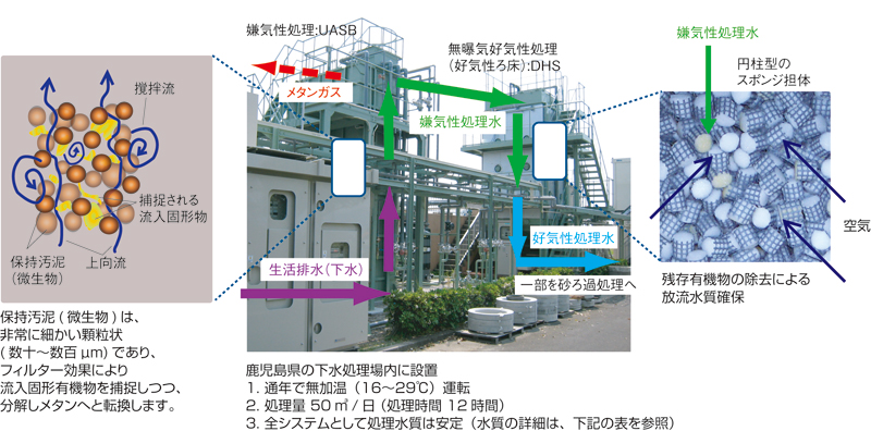 生活排水(下水)は有機性排水の大半を占め、水洗トイレ由来の固形性有機物が主成分です。また水質や水温の変動も大きいため、その状況に適した技術の開発が必要です。このような背景をもとに、今回開発した嫌気性処理法と省エネルギー型好気性処理法との組み合わせによる実証処理試験を鹿児島県の下水処理場にパイロットプラントを建設して行いました。