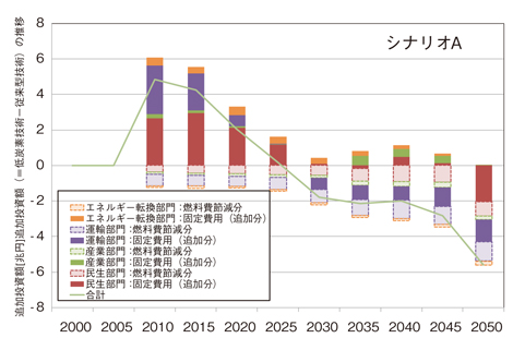 70%削減実現に要する総費用が最小になるような道筋を考えると、シナリオA・Bのいずれでも初期には年間5兆円程度の追加投資が必要となると見られる。しかし、初期の大幅な技術普及によるコスト低下、効率改善等により、省エネ、対策費用の低減が可能となり、期間全体ではトク(得)になる。また、国際競争力の強化が、エネルギーセキュリティの強化などにも役立つ。
