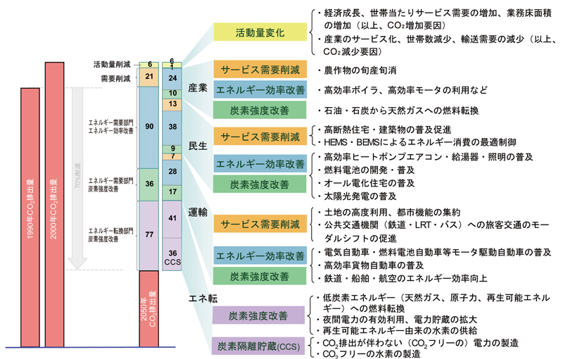 シミュレーションモデルを使っての検討により、この2つの社会に至るためには産業構造のサービス化、コンパクトな都市形成による徒歩や自転車利用への移行、公共交通へのモーダルシフト、建築物の断熱効率の向上、省エネ技術の開発、普及などにより、エネルギー需要を2000年比約40%削減し、他方、発電などのエネルギー供給側では、再生可能エネルギーの導入や、安全な原子力発電の維持など、二酸化炭素を直接出さない低炭素エネルギーの拡大により、需要と供給側の対策を合わせて二酸化炭素排出70%削減は可能になると結論づけています。