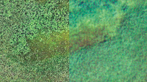 ほぼ同じ季節に同一場所を撮影したデジタル航空写真(右)とラジコンヘリ(左)の解像度の比較。デジタル航空写真の20cmの解像度では不可能な草本個体の確認が、ラジコンヘリ撮影では十分可能であることがわかる。