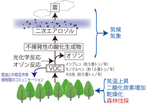 気象・気候変動に影響する植物起源のVOC植物から放出されるVOC類は大気中の反応によって、不揮発性の酸化生成物に変わります。その一部は微小な二次エアロゾルとなって太陽放射を反射し、地球大気を冷却します。さらに、雲凝結核として働けば、雲量の増加などの間接効果によって気象・気候に影響を与えます。また、イソプレンは大気中の窒素酸化物濃度が高い場合、光化学反応によって温室効果気体であるオゾンを生成します。従って、気候の変動や森林伐採による植物起源VOC発生量の変動は環境に対して大きなフィードバックをもたらすことが懸念されています。また、植物起源VOCの量的・質的な変化は植物と虫あるいは植物間の相互作用に影響を及ぼして森林生態系を撹乱する可能性もあります。