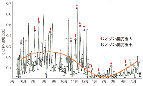 図2 松林で観測された大気中α-ピネン濃度の季節変化(国立環境研究所敷地内、午前11時、1980年5月~1981年5月)