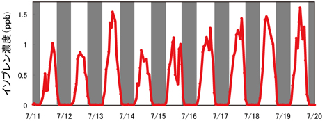 植物からのイソプレン放出は日射量に強く左右されるため、その大気中濃度は日中に最大となります。