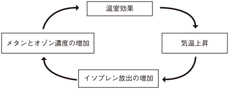 気温上昇により短期的にはイソプレン放出量は増えます。イソプレンの光化学反応によってオゾンが生成し、メタンの反応相手であるOHラジカルが減少します。その結果、温室効果気体であるメタンとオゾンが増え、温暖化を加速する可能性があります。