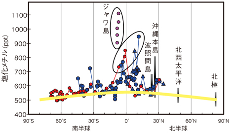 大気観測による塩化メチル発生源の推定北極(アラート)、北西太平洋、波照間島におけるモニタリング(灰色バー)、南極観測「しらせ」航海(北緯31度~南緯69度)(赤丸)、白鳳丸航海(青丸)のデータとMooreら(1996)による低中緯度の外洋上大気観測値から推定されたベースライン濃度の緯度分布(黄色線)、およびジャワ島(桃色丸)と沖縄本島(灰色バー)におけるスポット観測の結果。○で囲んだデータはジャワ島と航海中に島の付近で観測されたもの。この図から大量の塩化メチルが熱帯域の島から放出されている可能性が示唆されました。