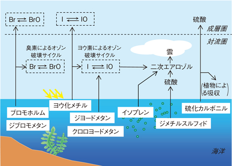 大気環境に大きな影響を与える海洋起源VOC海洋には植物プランクトン、大型藻類、バクテリアのような生物や溶存有機物の光化学反応によって作られた様々なVOC類が存在しています。磯の香りとして知られるジメチルスルフィドは大気中の反応によって硫酸に変わり、二次エアロゾルを生成します。ジヨードメタン等のヨウ素化合物は大気中に放出されると容易に光分解して、ヨウ素ラジカルを作ります。このヨウ素ラジカルは対流圏オゾンを触媒的に壊し、また、反応によってエアロゾルを作りやすいことが知られています。ヨウ素化合物に比べて寿命の長いブロモホルムやジブロモメタン等は一部が成層圏まで運ばれて、オゾン層破壊に寄与すると考えられています。海洋からはイソプレンも放出されていますが、陸上植物起源のものに比べるとずっと少ない量です。