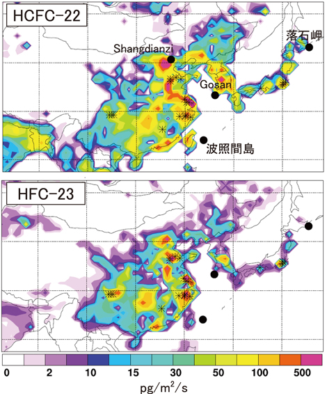 高頻度観測が可能にした詳細な代替フロン排出分布の推定波照間島、落石岬に続いて、韓国・Gosanでソウル大学が、中国・Shangdianziで中国気象局がハロカーボンの高頻度観測を開始しました。これらの観測データと大気輸送モデルを用いて東アジアにおけるハロカーボンの排出分布マップを得ることが可能になりました。上図はHCFC-22、下図はHFC-23の排出量分布(2008年)の推計結果です。HCFC-22は冷媒として広く使われている代替フロンであり、HFC-23の大半はこのHCFC-22生産の副産物として非意図的に放出されています。HFC-23は大気寿命が長く(246年)、単位重量当たりで二酸化炭素の14800倍という非常に強い温室効果を持っています。この化合物は、先進国では排ガスの加熱処理やプロセスの最適化などによって排出はかなり低く抑えられていますが、発展途上国ではまだ十分な対応ができていない所があります。HFC-23の排出量が特に多い地域は、HCFC-22生産工場(米印)と一致していることが分かります。このことは、本研究に用いられた観測データとモデル解析が非常に精度の高い排出源マップを与えていることを示しています。