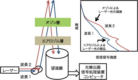 図1 レーザーレーダー(ライダー)によるオゾン、エアロゾル測定の原理