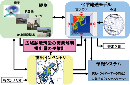 最近まで、観測研究にとって数値モデルは結果の説明の手段、モデル研究者にとっては観測データは入力データあるいは検証データでしたが、観測データと数値モデルを組み合わせることによって、大気汚染物質や黄砂の発生量分布の精度を高め、大気汚染や黄砂の予測の精度を高めることができるようになりました。この、観測データと数値モデルを用いた逆推計あるいは同化という手法には、衛星観測データのような面的なデータ、ライダーや大気成分自動観測装置による時間的に連続的なネットワーク観測データが必要です。